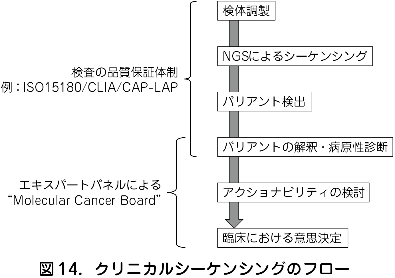 プレシジョンメディスンを実装するクリニカルシーケンシングにおいては,検査室水準の検体調製,シーケンシング,情報解析を行う必要がある.その品質保証体制には,ヨーロッパ・日本を中心としたISO,アメリカの基準であるCLIA およびCAPLAPがある(図14).検出したバリアントの臨床的意義の解釈・病原性診断は,これまでの限られた専門家の経験や主観に基づく診断から脱却して,より客観的な診断を行う必要性が示されている(図15).